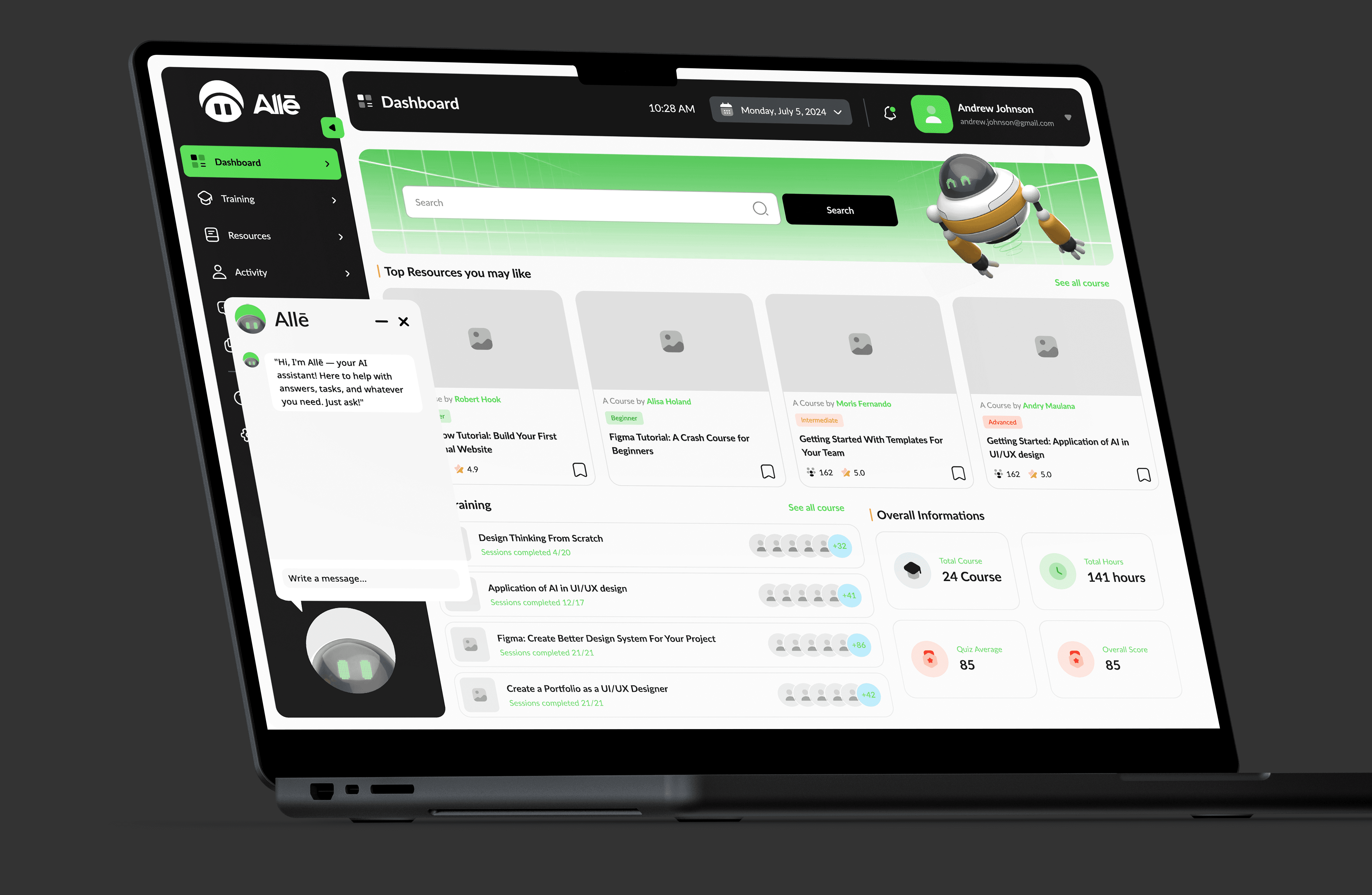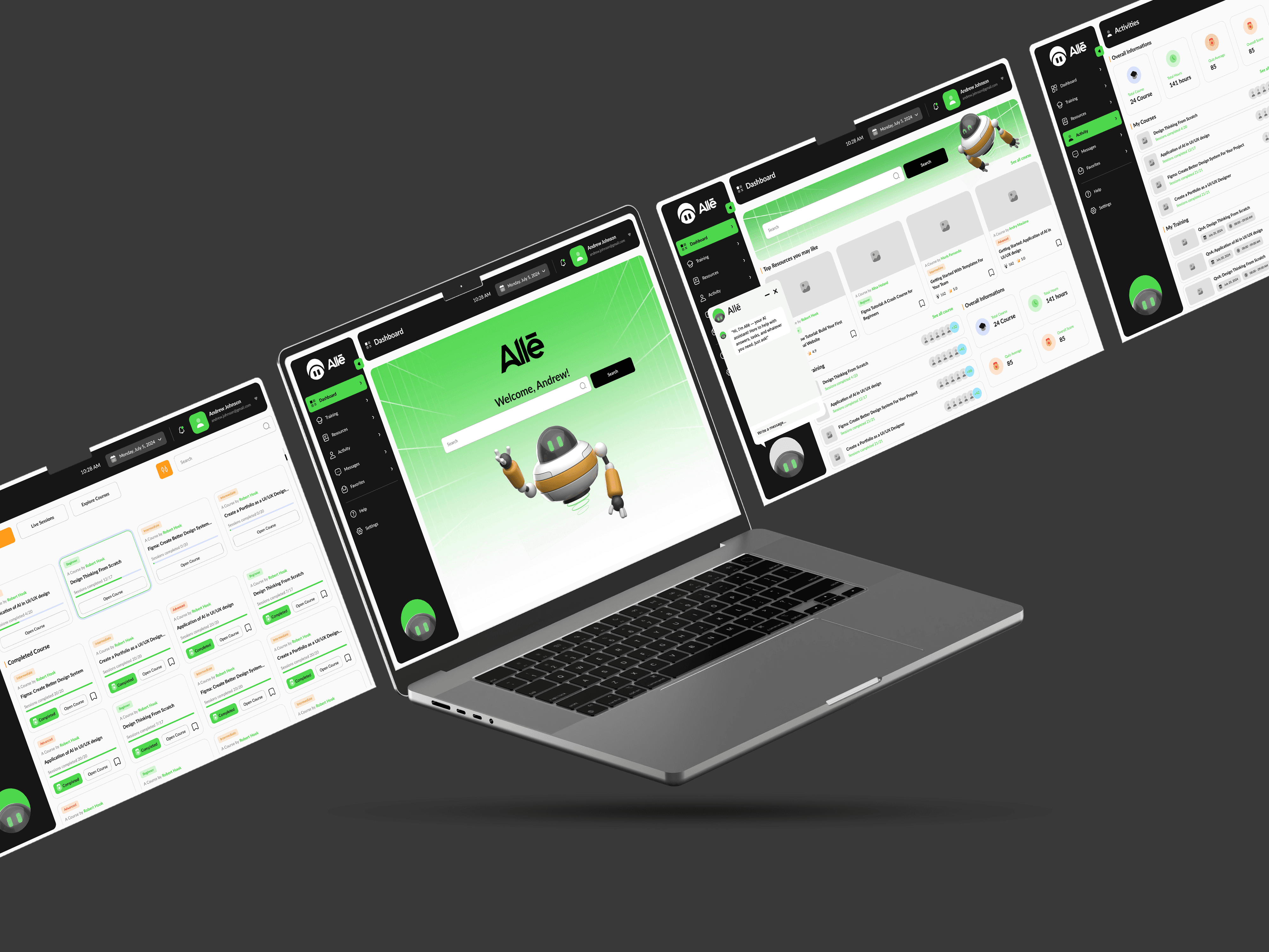 I created the logo, designed the Allē robot mascot, and developed the full brand identity system. From there, I designed the app and website layout, bringing the brand to life across every digital touchpoint. That visual foundation informed the Field Enablement Center, a centralized platform built to consolidate tools, streamline workflows, and give teams the guidance they needed without the friction of jumping between systems. The platform included scenario-based pathways, a smart searchable resource library, dynamic training modules, and permission-based content governance built to grow with the team.